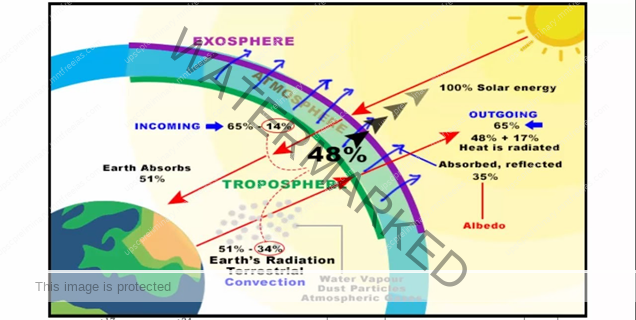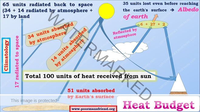 The heat energy reflected, absorbed and radiated back into the space equals the energy received by the earth. Incoming radiation and the outgoing radiation pass through the atmosphere. The earth maintains its optimum temperature.