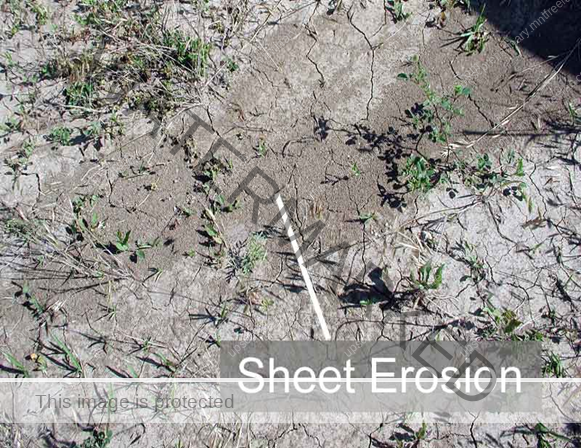 Sheet erosion takes place on level lands after a heavy shower and the soil removal is not easily noticeable. But it is harmful since it removes the finer and more fertile topsoil.