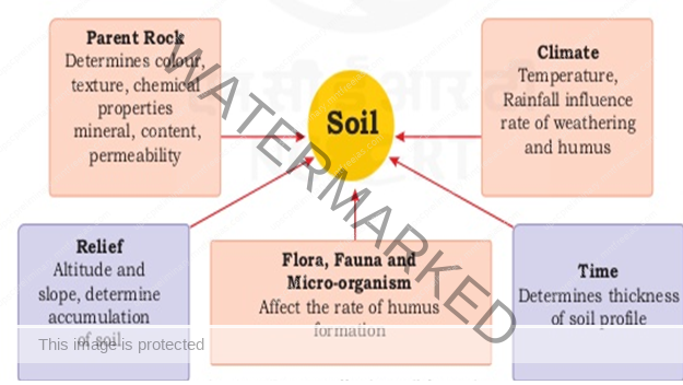 The major factors affecting the formation of soil are Relief, Parent Material, Climate, Vegetation and other life-forms and time. Besides these, human activities also influence it to a large extent.