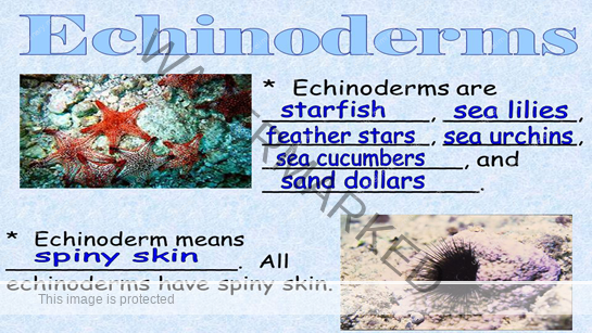 Echinoderms are marine animals that live in the ocean. Common echinoderms include the sea star, sea urchin, sand dollar and sea cucumber. Most echinoderms have arms or spines that radiate from the center of their body. The central body contains their organs, and their mouth for feeding.
