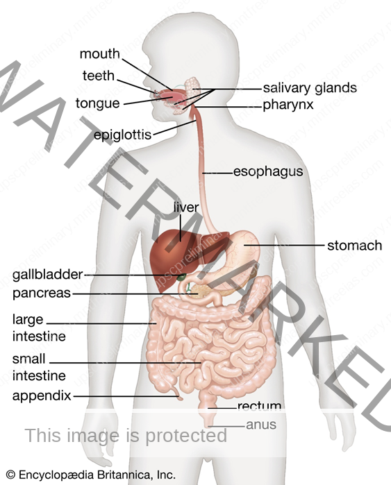A diagram of the human digestive system detailing various components